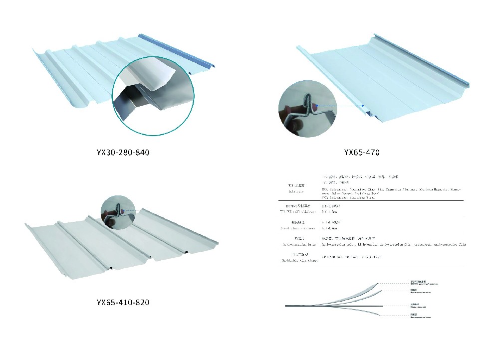 470 型(YX65-470),有效寬度 470mm,高肋深波,結(jié)構(gòu)強(qiáng)度高,抗風(fēng)抗雪、排水快,適合大跨度 / 低坡度 / 沿海臺(tái)風(fēng)區(qū);840 型(YX30-280-840),有效寬度 840mm,波高平緩,施工效率高、搭接少,適配常規(guī)中小跨度廠房、物流倉(cāng)儲(chǔ);820型(YX65-410-820),有效寬度820mm,采用360°直立鎖邊施工,瓦面無(wú)釘,接縫數(shù)量少,施工效率高。